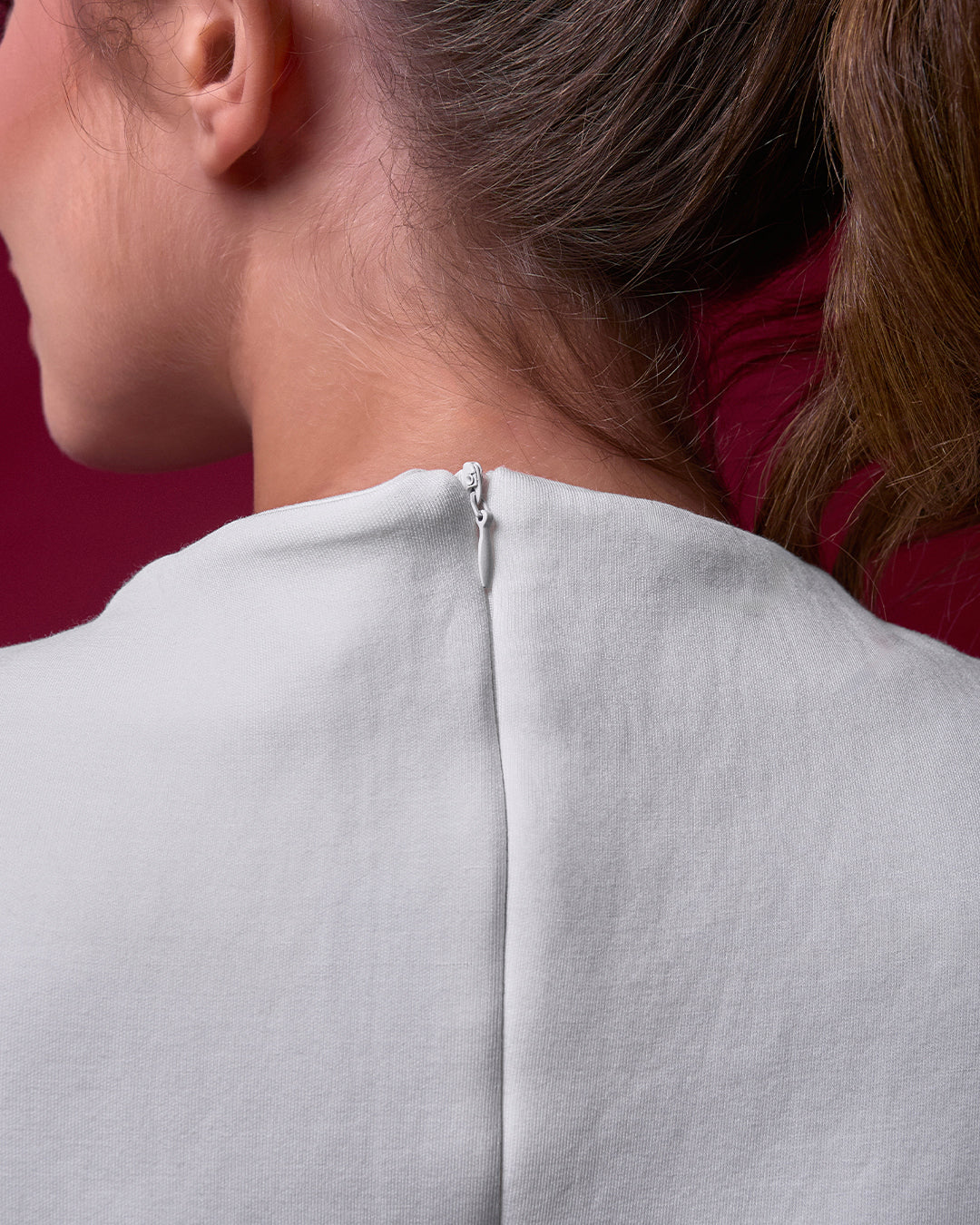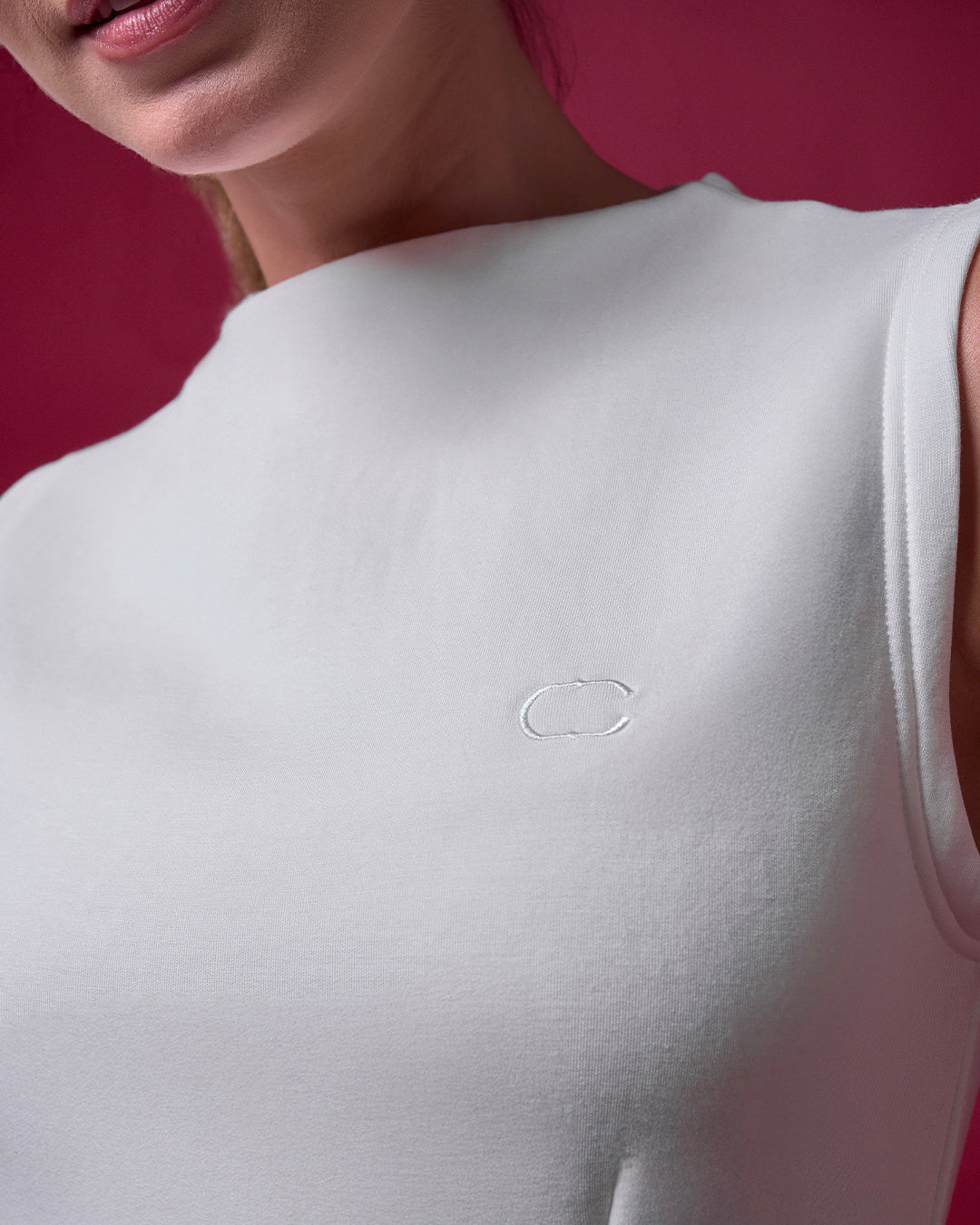 A SLEEK AND REFINED SILHOUETTE WITH CLEAN DART LINES THAT SUBTLY SHAPE THE FORM. DESIGNED WITH A HIGH NECKLINE AND HIDDEN BACK ZIP FOR A SMOOTH, MODERN FINISH. CRAFTED FROM OUR SIGNATURE CAKENIS COOLING COTTON BLEND, OFFERING A STRUCTURED YET SOFT FEEL—PERFECT FOR STANDALONE WEAR OR LAYERING. COMPLETED WITH A TONAL “C” EMBROIDERY FOR A REFINED MONOCHROME STATEMENT.
