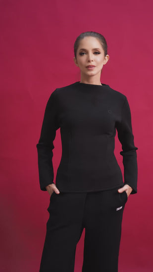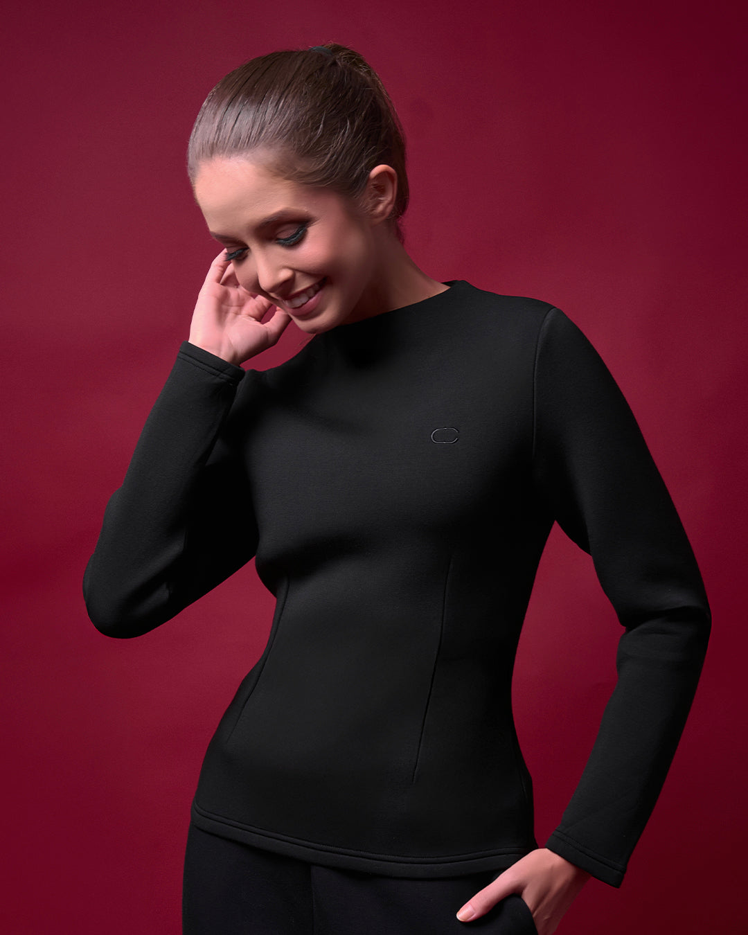 MINIMAL YET ELEGANT, THIS LONG-SLEEVE TOP FEATURES CLEAN LINES AND A SCULPTED FIT THAT FLATTERS THE FORM. DESIGNED WITH A HIGH CREW NECK AND REFINED DART SEAMS, IT OFFERS A STRUCTURED, SOPHISTICATED SILHOUETTE. MADE FROM OUR SIGNATURE CAKENIS COOLING COTTON BLEND, IT FEELS SMOOTH, LIGHT, AND BREATHABLE. FINISHED WITH A TONAL “C” EMBROIDERY FOR A SUBTLE, MODERN TOUCH.