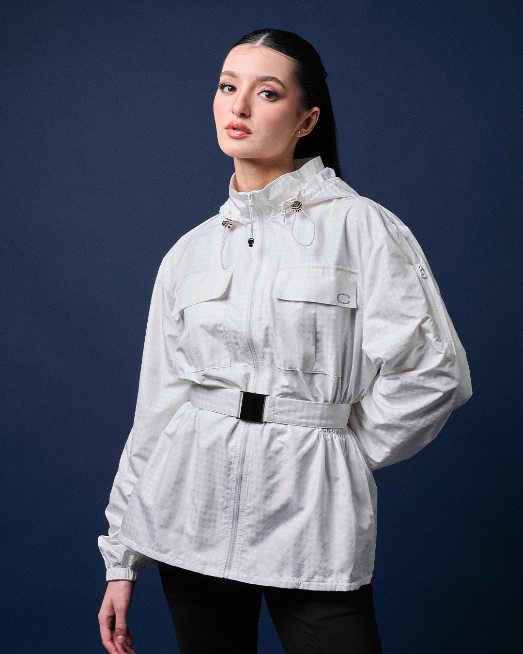 DESIGN: SHAPED SPORTS OUTERWEAR WITH SKI JACKET SILHOUETTE, DETACHABLE BELT FOR DEFINED OR RELAXED FIT, STRETCHABLE GATHERS AT WAIST FOR FLATTERING SHAPE, FRONT AND SLEEVE POCKETS, DETACHABLE HOODIE WITH TWO SIGNATURE CAKENIS METAL TOGGLES FOR FULL COVERAGE, INNER LINING FOR COMFORT AND SWEAT PREVENTION, SMALL REFLECTIVE CAKENIS LOGO AT FRONT, EMBROIDERED CAKENIS LOGO ON BACK BELT, REFLECTIVE LOGO AT BACK.