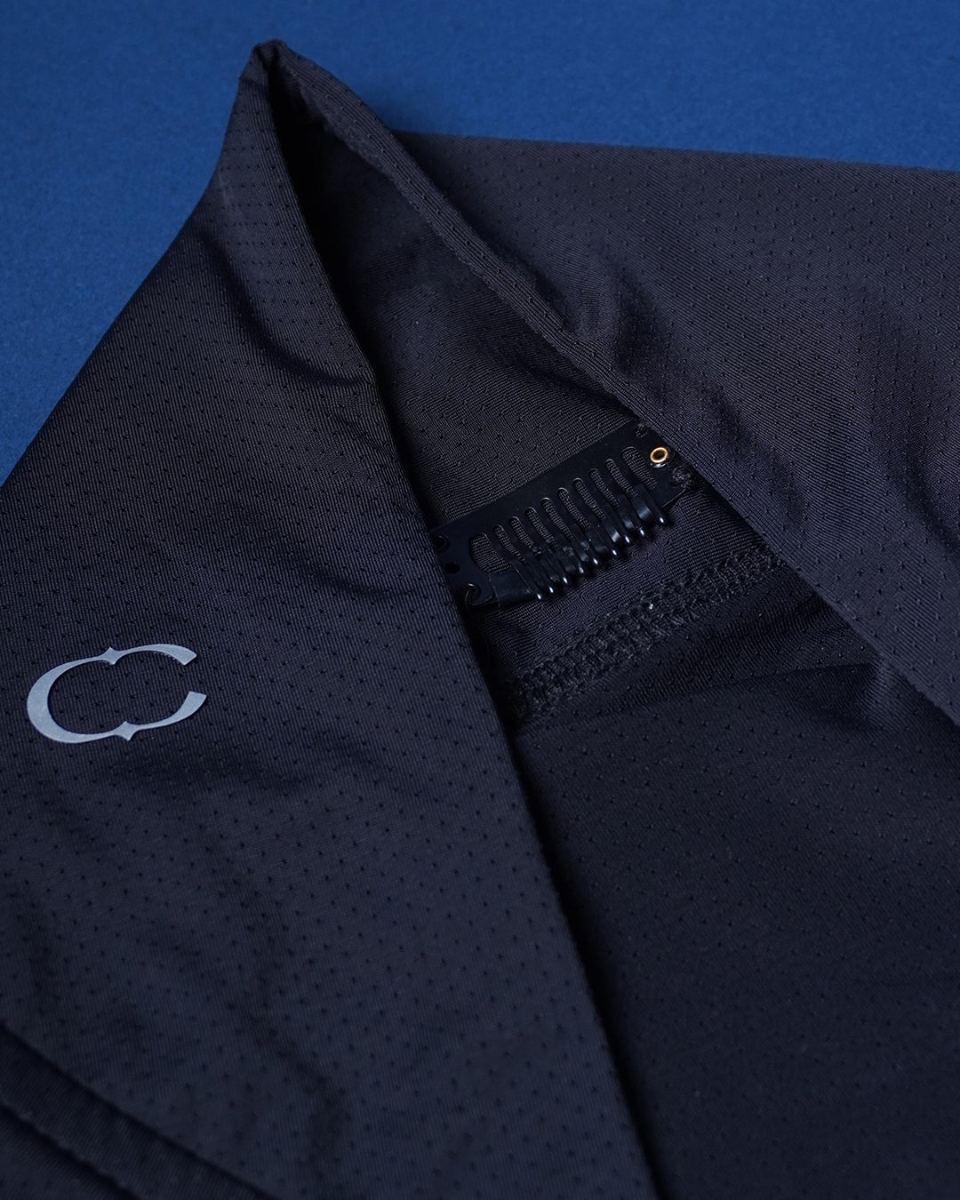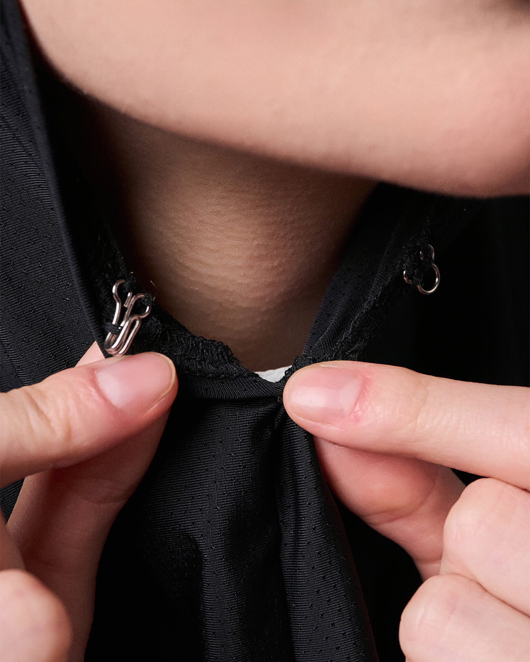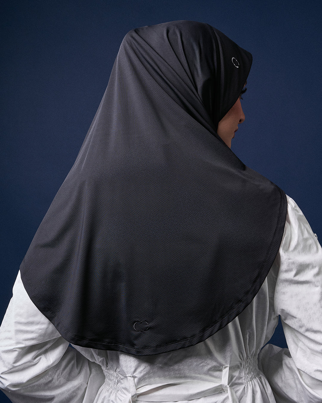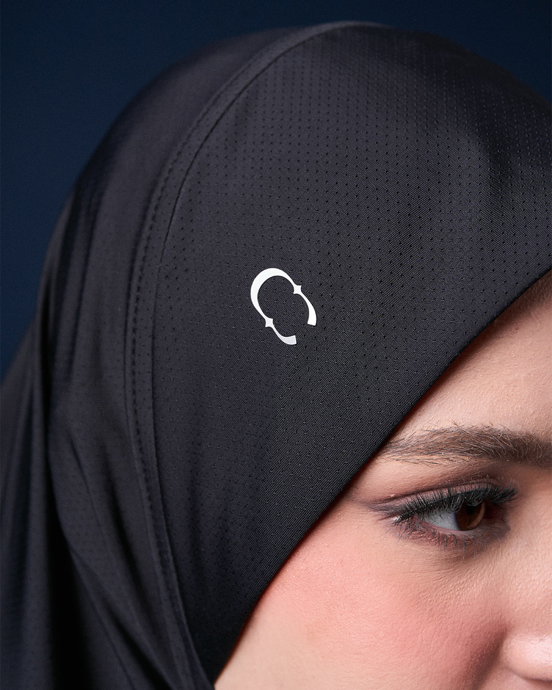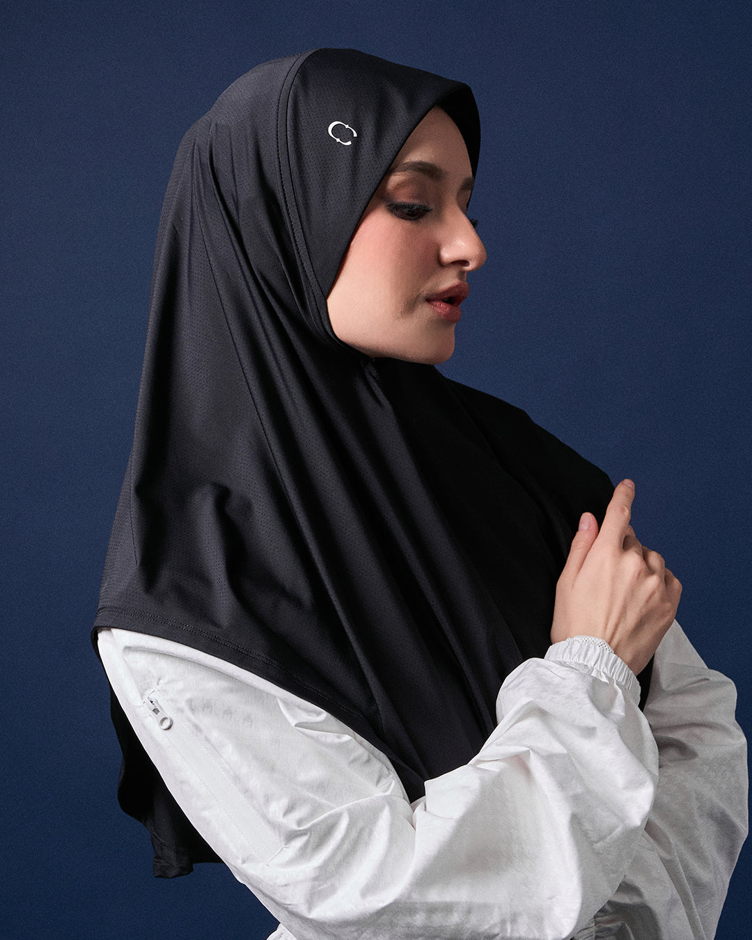 DESIGN: INSTANT HIJAB IN BREATHABLE MATERIAL, DOUBLE FABRIC AT SCARVES AREA WITH SEWN-IN CLIP TO SECURE HAIR, FRONT HOOK AND EYE FOR FACE ADJUSTMENT, CHEST ZIPPER DESIGN ALLOWS OPENING AND TYING TO BACK, SNAP BUTTON AT BACK, SMALL REFLECTIVE CAKENIS LOGO AT FRONT SIDE OF SCARVES.