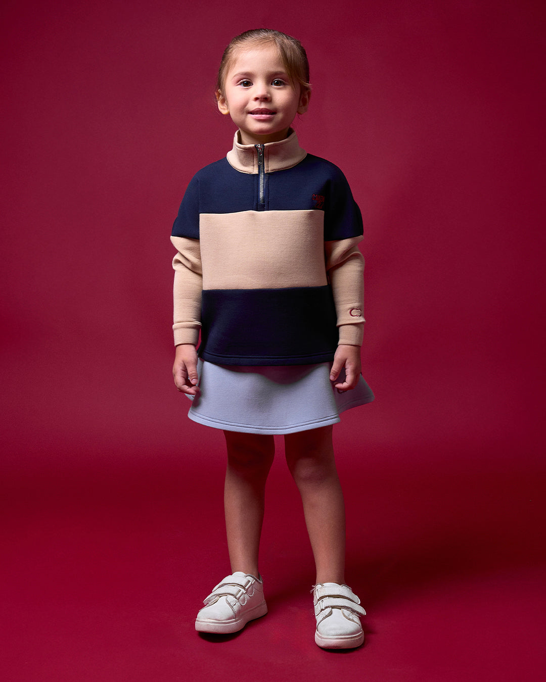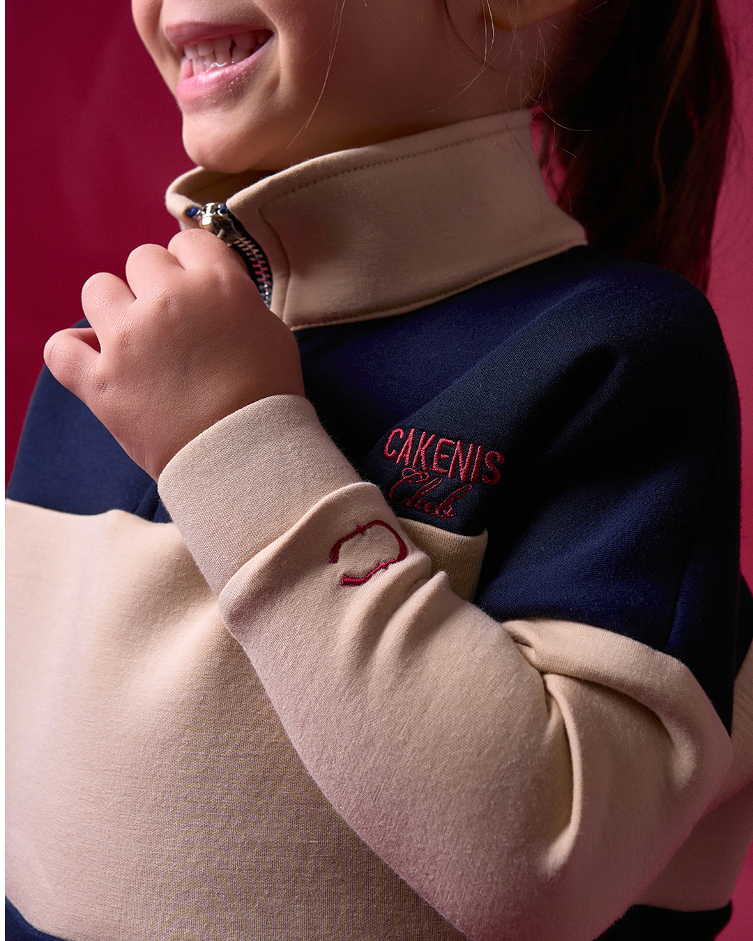 UNISEX KIDS COLOR-BLOCK ZIP SWEATSHIRT DESIGNED FOR COMFORT AND STYLE. FEATURES A FRONT ZIP WITH HIGH NECKLINE FOR EASY WEAR AND A SPORTY LOOK. THE COLOR-BLOCK PANELS ADD A FUN, PREMIUM TOUCH, FINISHED WITH A SMALL CAKENIS TAG AT THE BACK. MADE FROM CAKENIS COOLING COTTON BLEND TO KEEP KIDS LIGHT, COOL, AND COMFORTABLE ALL DAY.