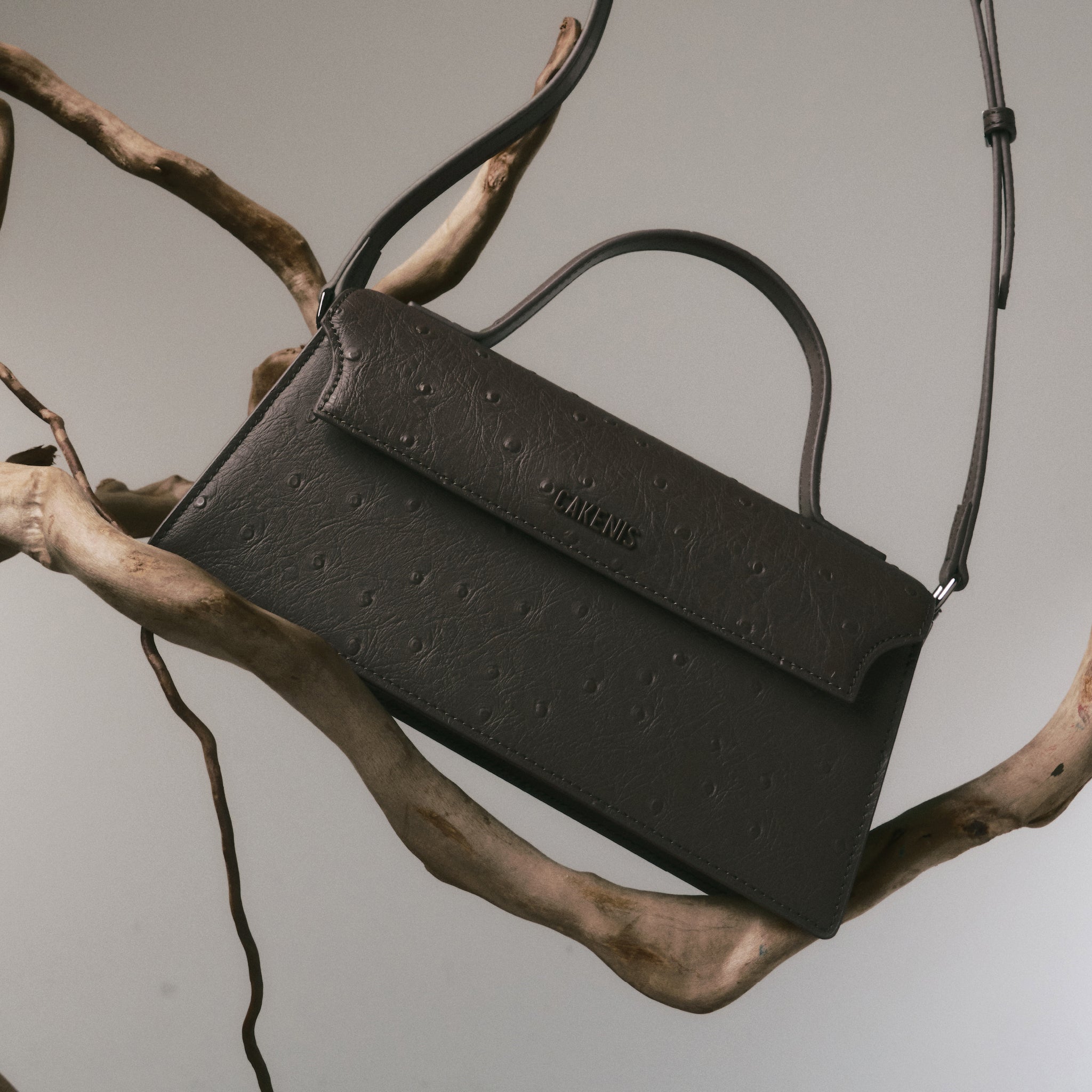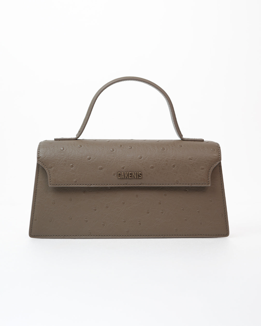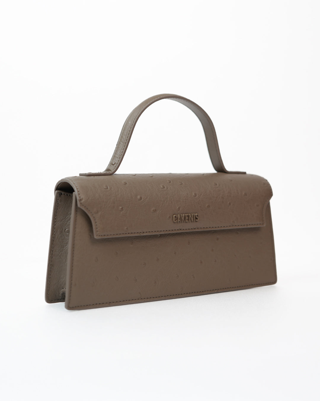Heidi Bag is crafted entirely from 100% leather both inside and out, featuring a refined ostrich-embossed texture with raised grain for depth. Designed with a magnetic flap opening, one long adjustable strap, gold hardware, one metal keychain inside, a divider pocket for cards, and finished with the Cakenis logo.